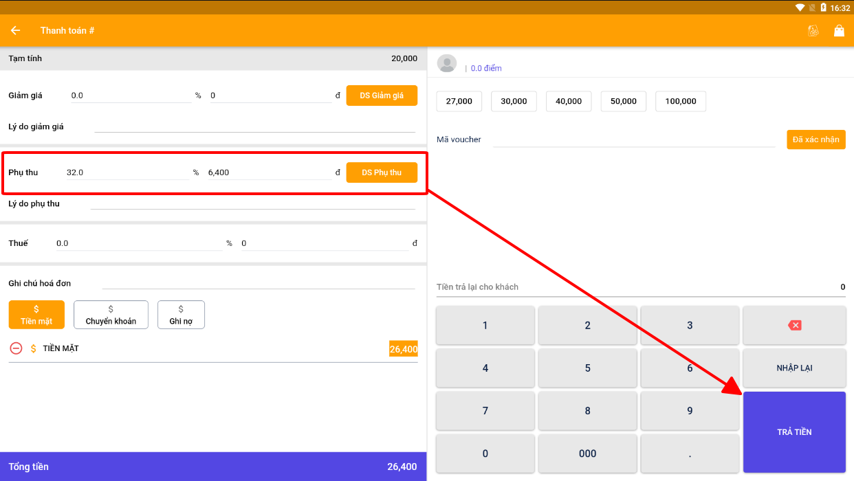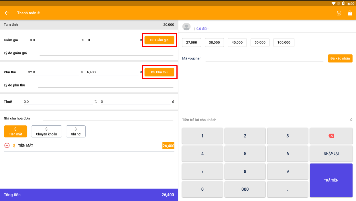 *(Tạo phụ thu, giảm giá hóa đơn nhanh trên nền app linh hoạt)*