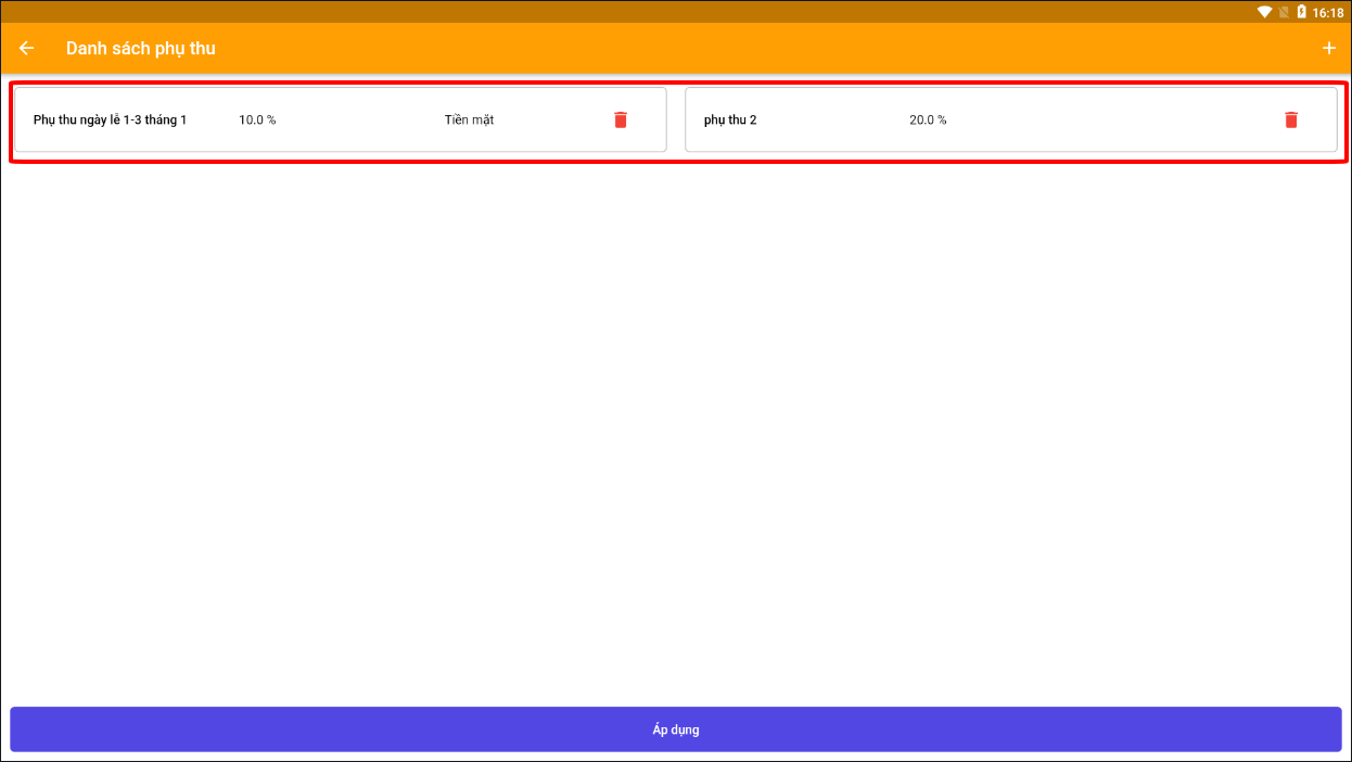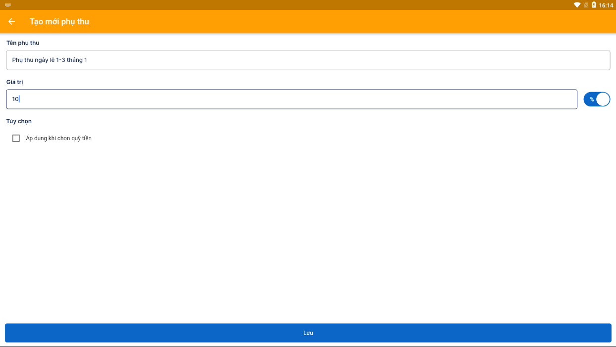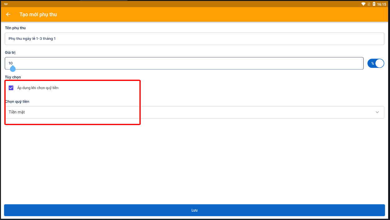 Nếu chỉ muốn phụ thu khi thanh toán tiền mặt (thanh toán chuyển khoản sẽ không phụ thu) thì tích vào ô **"Áp dụng khi chọn quỹ tiền"** > chọn quỹ tiền > lưu lại