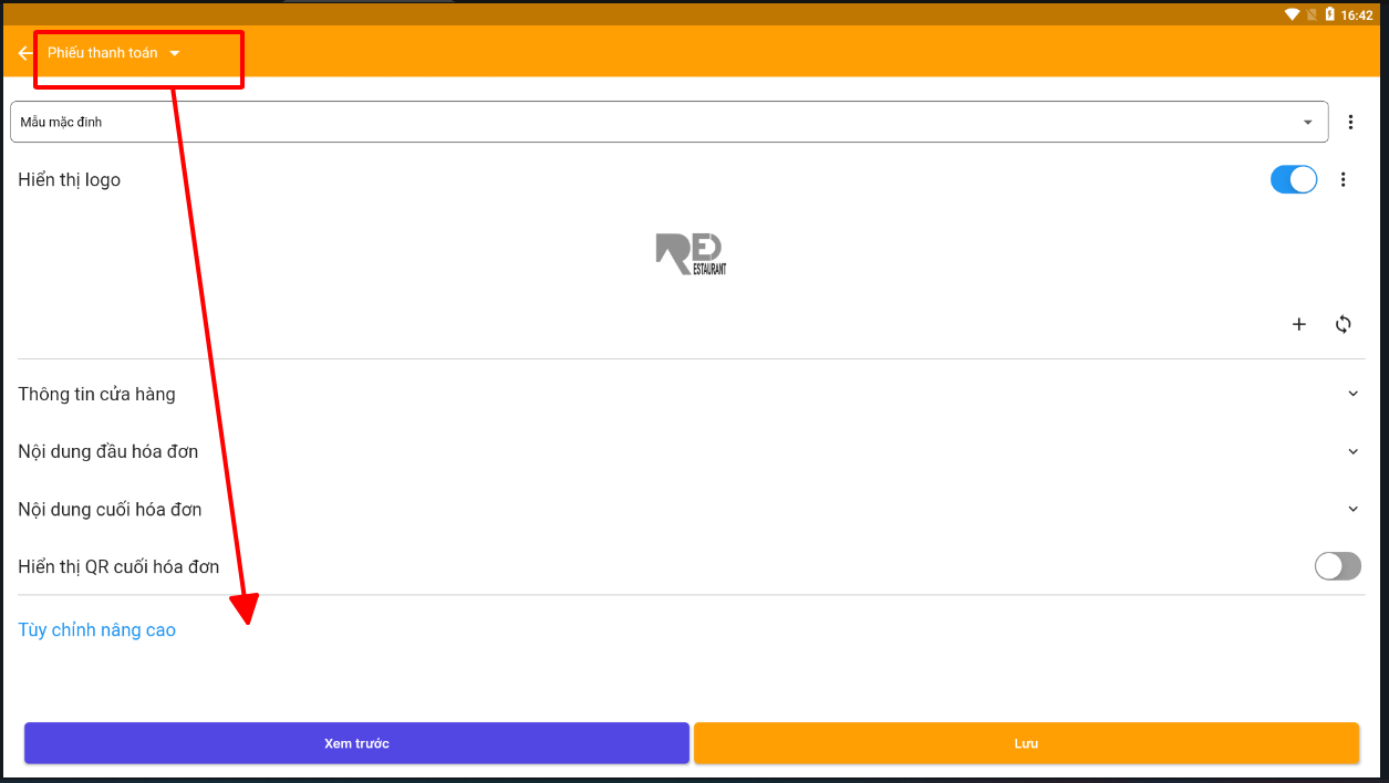 Chọn các mẫu phiếu thanh toán hoặc tạm tính để chỉnh sửa > sau đó ấn tùy chọn nâng cao