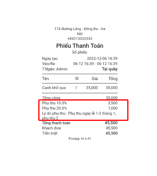 Hóa đơn in ra cũng sẽ hiển thị toàn bộ các phụ thu đã chọn