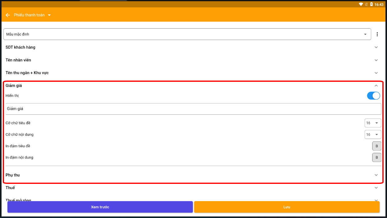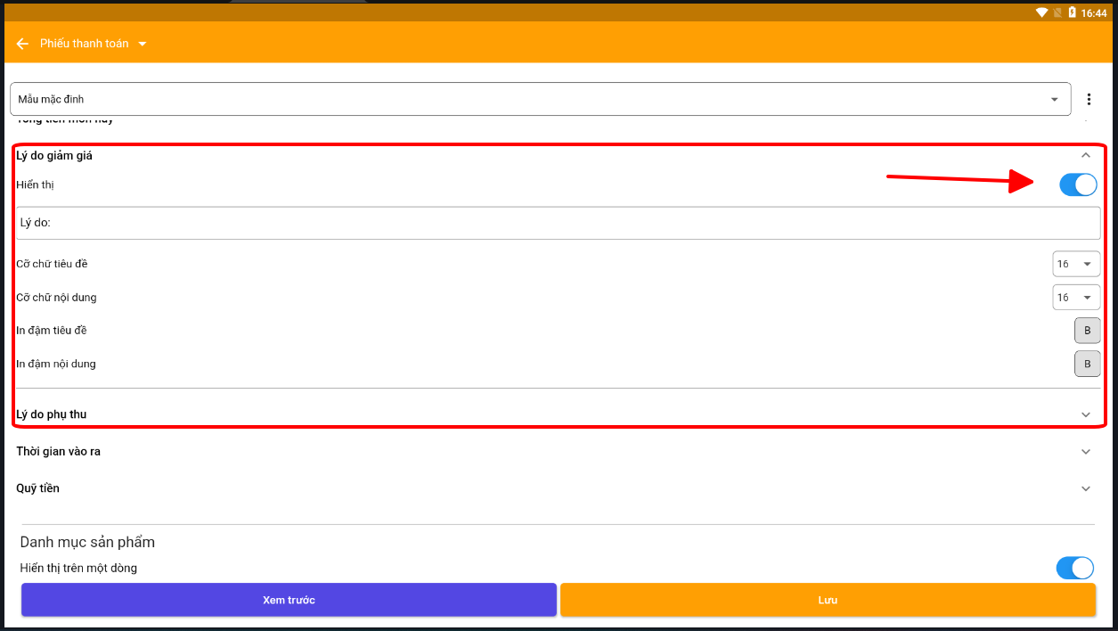 Có thể bật thêm lý do giảm giá, phụ thu nếu muốn