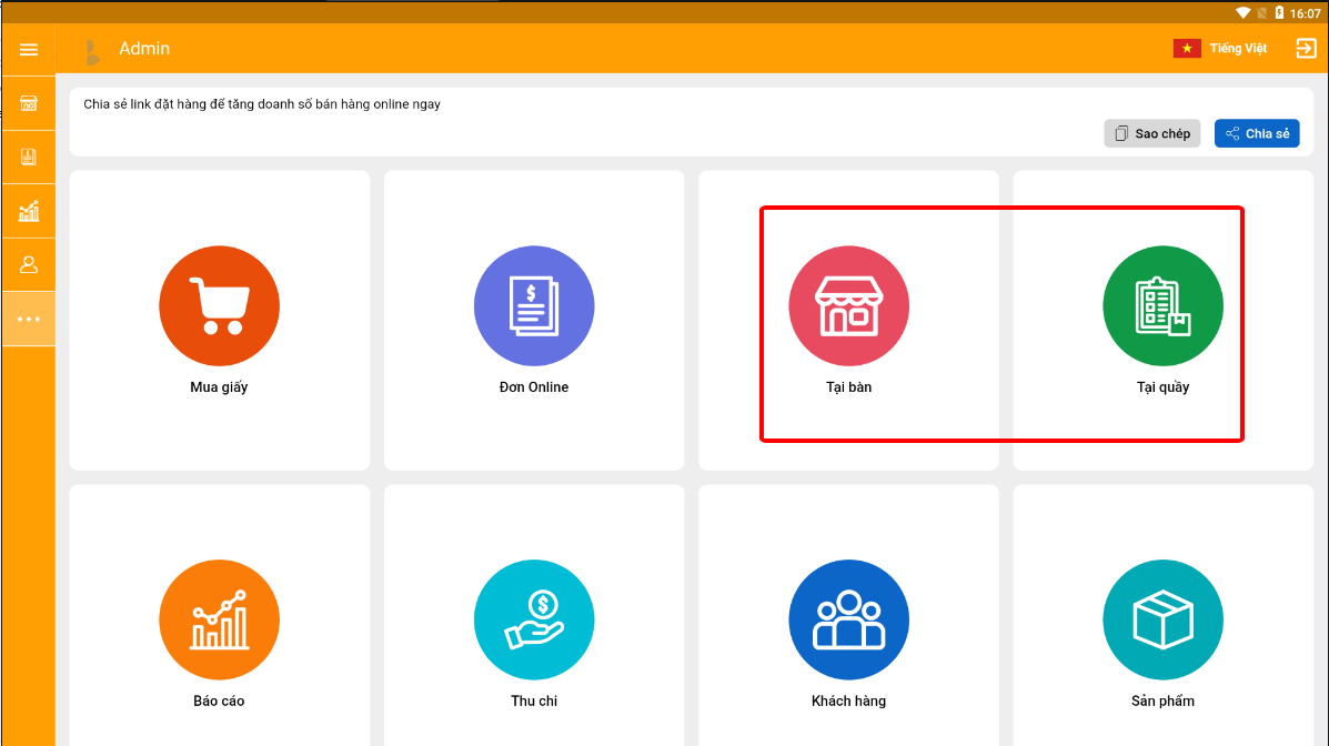 Tại giao diện bán hàng **"Tại bàn"** hoặc **"Tại quầy"**