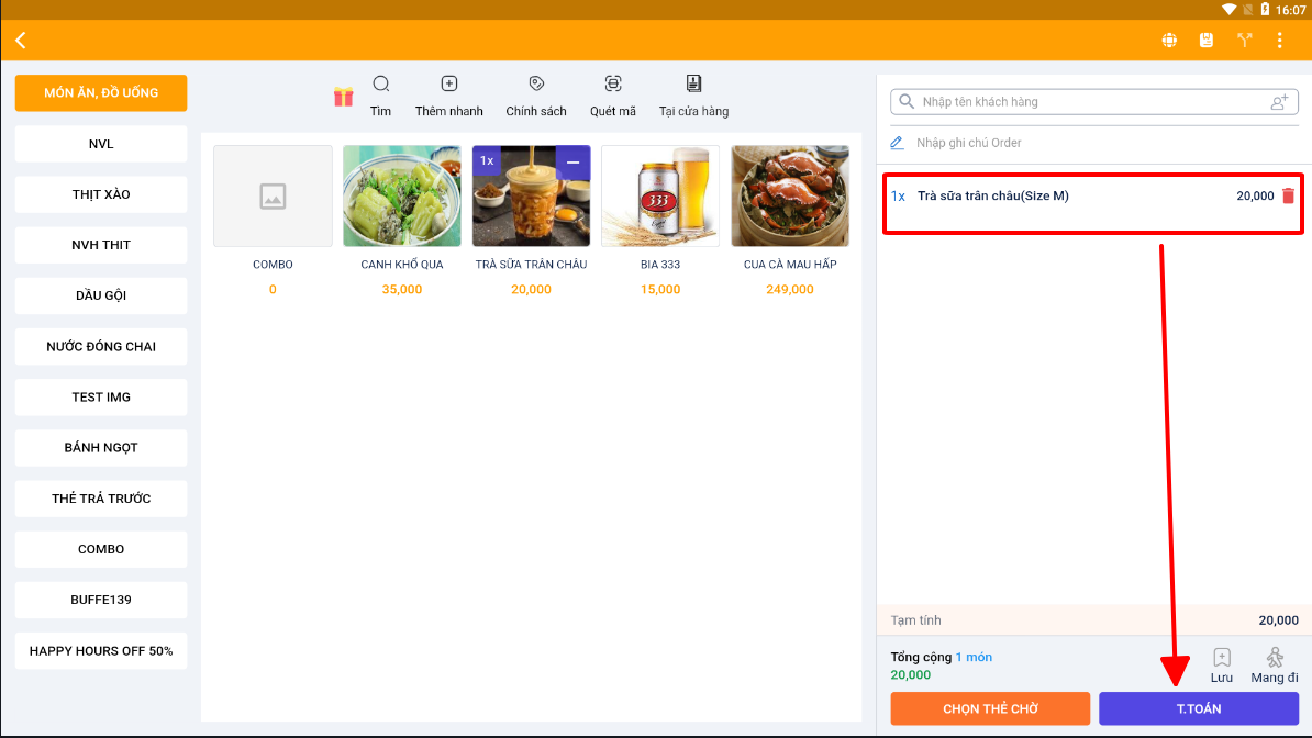 Tại màn hình order chọn 1 món bất kỳ > thanh toán